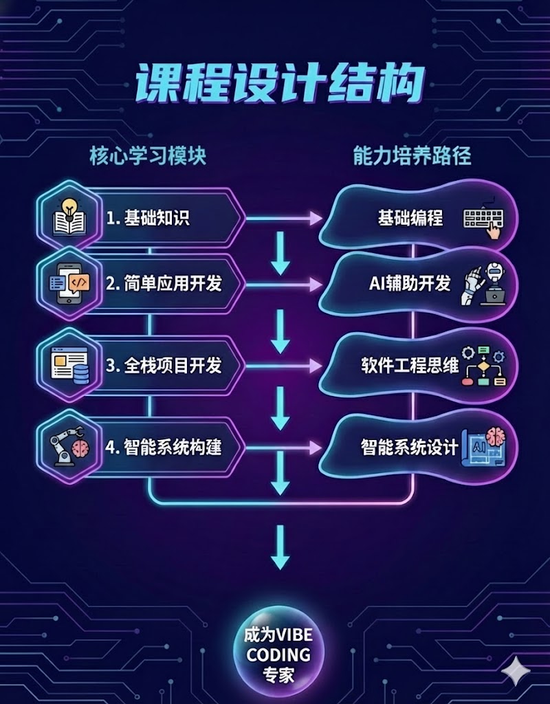 培养学生的工程化意识和质量验证能力,通过系统化的训练,使学生不仅掌握初步的AI辅助编程技术,还具备初步的模块化开发、架构设计和软件测试和验证的综合能力。