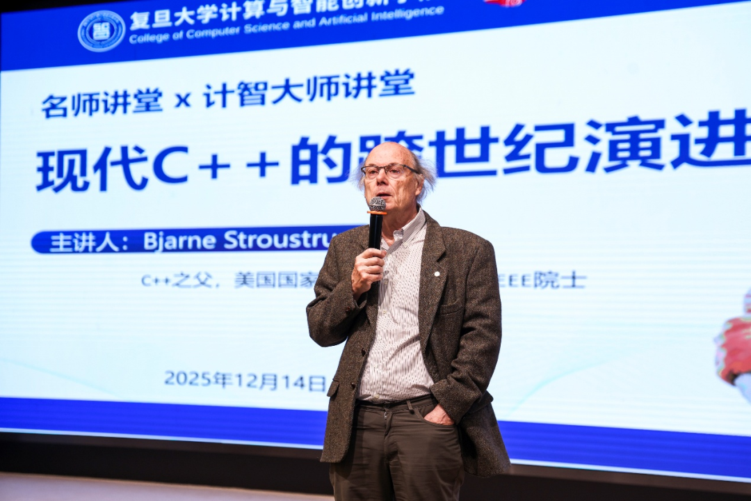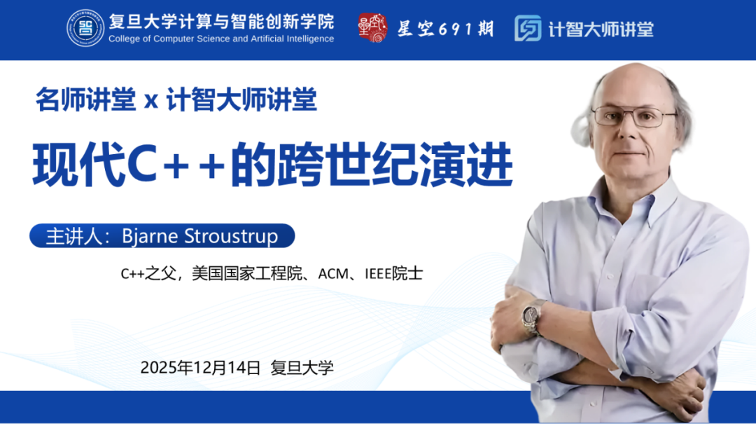 12月14日上午,复旦大学计算与智能创新学院、复旦大学团委联合主办的“名师讲堂”暨“计智大师讲堂”活动在邯郸校区光华楼东辅楼吴天凡报告厅成功举办。本次活动邀请到了C++之父Bjarne Stroustrup教授为广大师生及校友作报告,主题是《现代C++的跨世纪演进》。本次活动由复旦大学学生会、计算与智能学院分团委学生会、CSDN、奇点智能研究院协办。报告会由复旦大学计算与智能创新学院副院长彭鑫老师主持,来自学校各院系的师生以及校友300余人参加了本次活动。