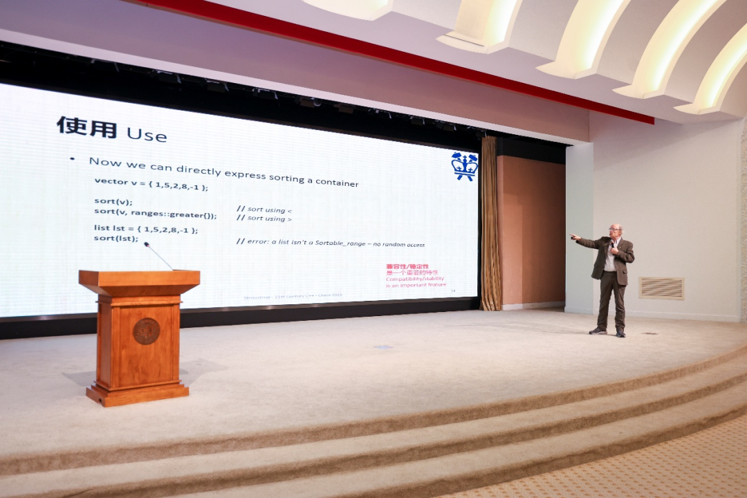 在接下来的报告环节中,Bjarne Stroustrup教授以“21st Century C++”为题系统阐述了C++语言的核心理念与演进方向。他指出,C++从一开始就被设计为一门持续演进的语言,随着应用规模的不断扩大,新特性应与经典特性有机结合,最终将语言的价值体现于应用程序的质量之中。他结合资源管理与错误处理、基于概念的泛型编程、标准库模块化、性能优化以及编码指南等关键话题,并通过丰富的程序案例,为听众清晰地勾勒出了现代C++的演化路径和发展方向。