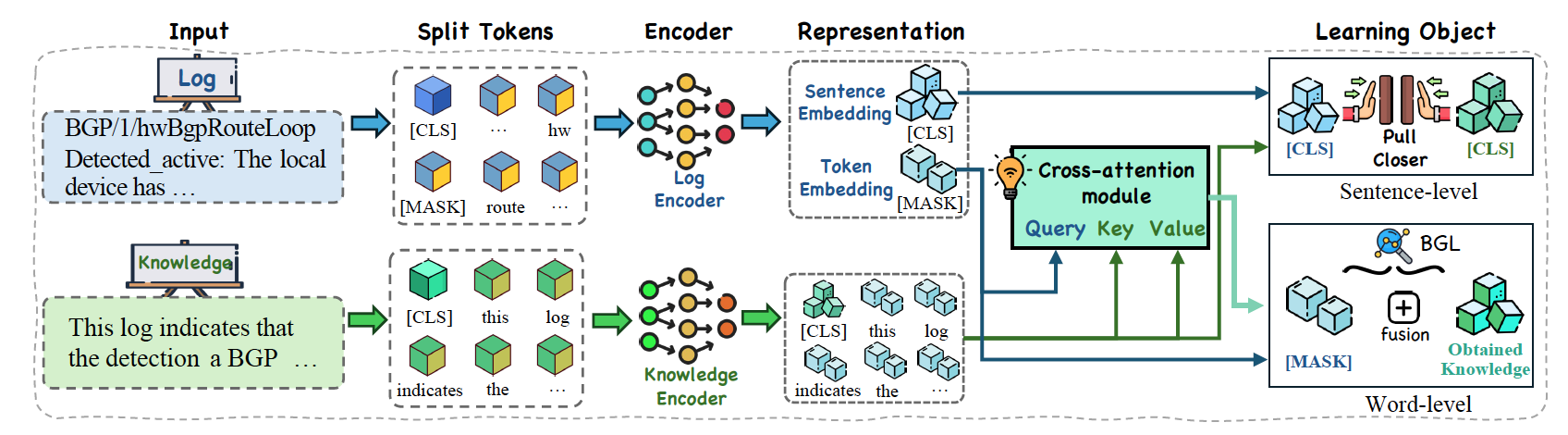 为将大模型的专家知识有效迁移至小模型,LUK框架创新性地引入多专家协同机制,借鉴软件工程中的瀑布模型,通过“总监——执行者——评估者”三类角色提示,以日志分析为专用任务,引导大模型协作构建精准、完整的日志领域知识体系。同时,在蒸馏出领域知识后,LUK提出了分层知识增强预训练策略,将词级别的细粒度知识感知与句子级别的宏观语义对齐任务相结合(如图2所示),既教会模型理解每个专业词汇的含义,又让其掌握由这些词汇构成的完整句子的意图,为下游分析任务奠定知识基础。实验结果表明,经LUK增强后的小模型(如110M参数的BERT)在多项日志理解任务中展现出接近专家的分析能力。仅需使用1%的标注数据,其性能便可逼近全量监督学习的水平,同时,其推理速度比直接调用GPT-4o快700倍以上,为在资源受限的边缘终端部署强大的日志分析能力提供了可能。