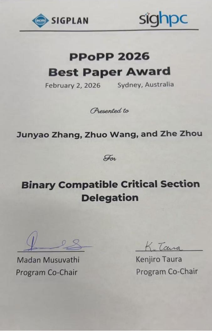 2026年2月,第31届 ACM 并行程序设计原理与实践国际会议(PPoPP 2026)在澳大利亚悉尼举行。复旦大学计算与智能创新学院周喆老师课题组的论文《Binary Compatible Critical Section Delegation》脱颖而出,荣获大会唯一的“最佳论文奖”(Best Paper Award)。