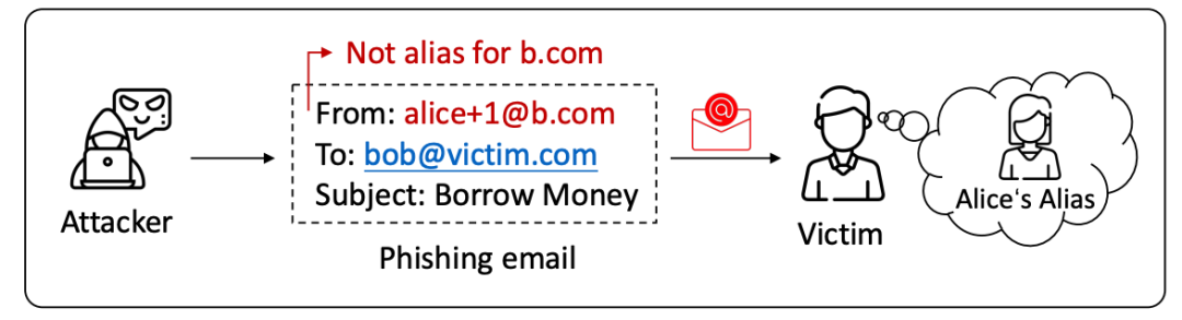 不同邮箱服务提供商的别名规则也无法通用,因此即使用户了解别名机制,对别名规则的错误假设会导致别名误认攻击。例如,当用户习惯了加号后缀是常见的别名规则时,攻击者可以在一个不支持加号别名的邮箱提供商处注册邮箱账号(如下图的alice+1@b.com),以此伪装成受害者熟人的别名邮箱,从而诱导受害者点击钓鱼邮件。