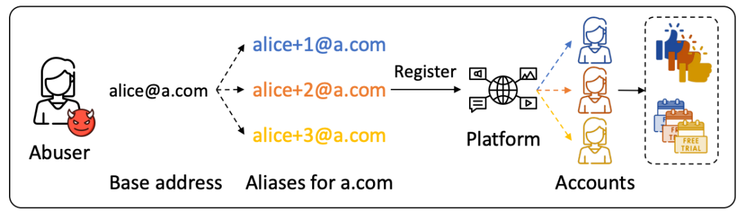 因此,攻击者可以基于主邮箱alice@a.com衍生出多个别名邮箱地址,在同一平台中注册多个账号,以此实现利用一个邮箱来多次免费试用高级功能、绕过资源限制、或充当水军操纵社交媒体等目的。