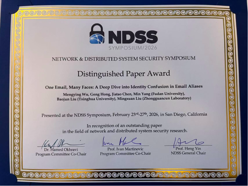 复旦大学计算与智能创新学院系统软件与安全实验室的研究成果《One Email, Many Faces: A Deep Dive into Identity Confusion in Email Aliases》入选网络安全国际顶级会议NDSS 2026(CCF-A类),并荣获杰出论文奖(Distinguished Paper Award)。这是对由邮箱别名机制导致的身份混淆问题的首次系统性分析,深入研究了不同邮箱服务提供商的别名机制,不同平台处理邮箱别名的能力以及邮箱别名在现实场景的滥用攻击。