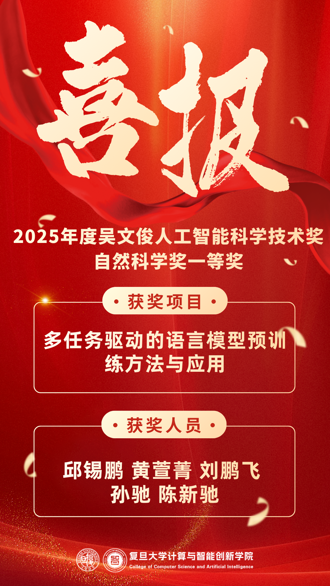 近日,中国人工智能学会正式颁发了2025年度吴文俊人工智能科学技术奖。计算与智能创新学院邱锡鹏教授牵头的项目“多任务驱动的语言模型预训练方法与应用”荣获2025年度吴文俊人工智能科学技术奖自然科学奖一等奖。