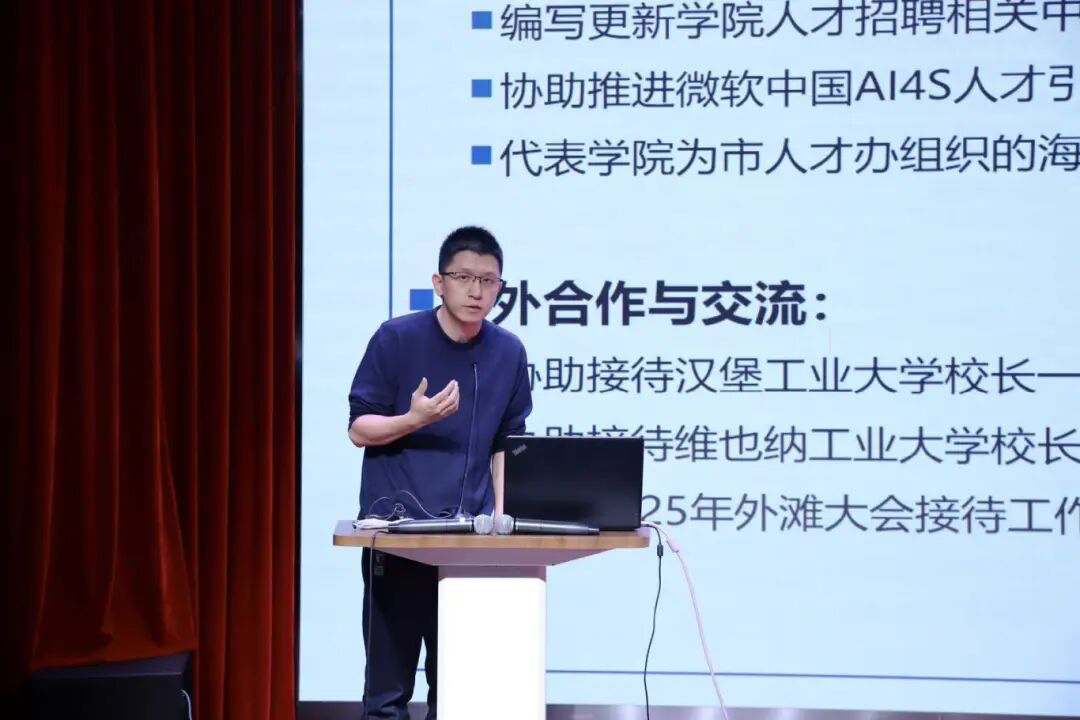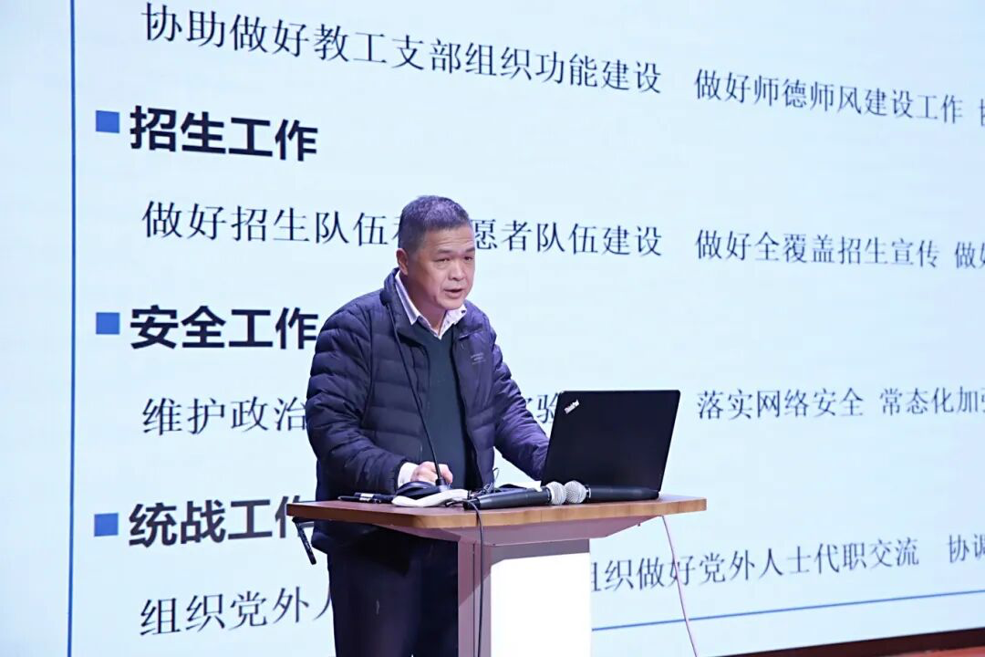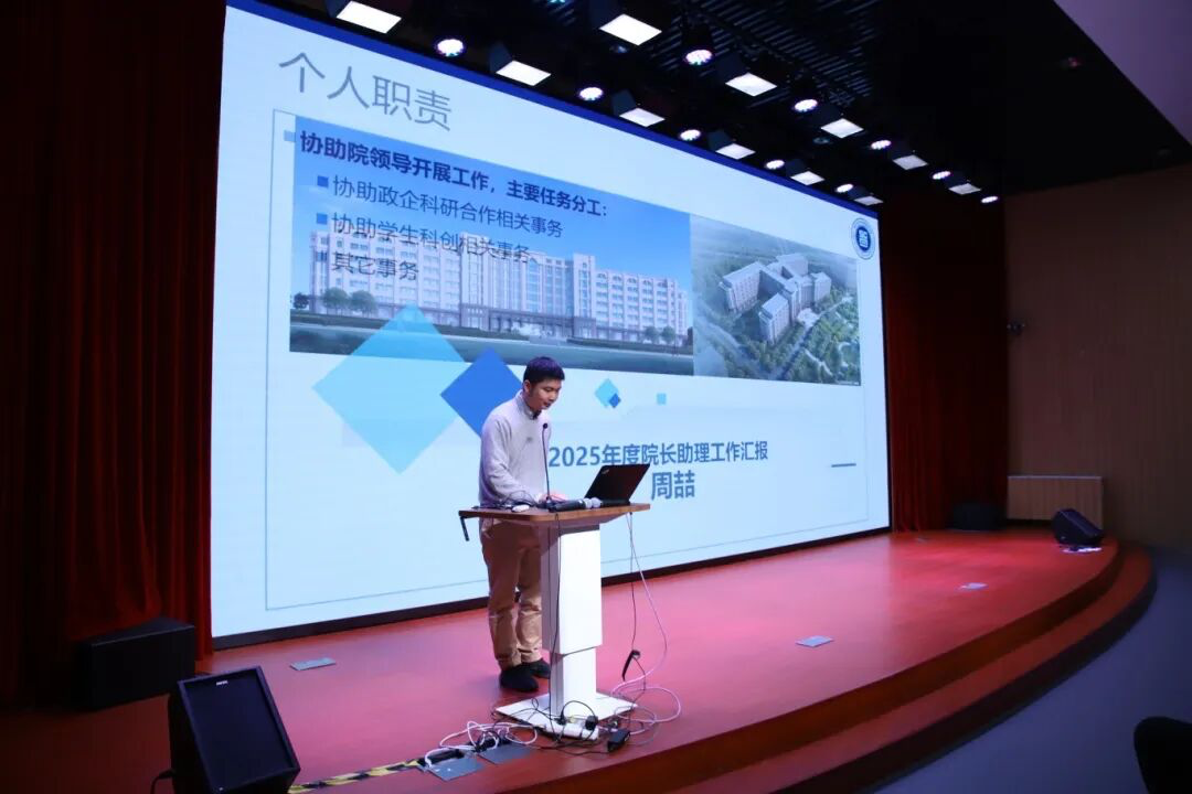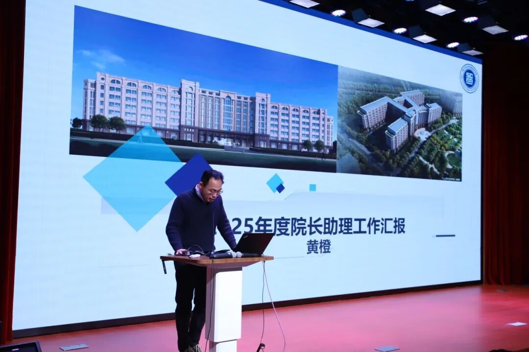 王新在全院大会上就2025年度学院党委工作进行总结并作个人述职述廉。他表示,学院党委始终围绕学校改革与发展的核心任务,切实发挥把方向、管大局、保落实的作用,通过深入研判、周密组织、广泛发动与全力保障,团结带领全院师生党员投身重点攻坚。