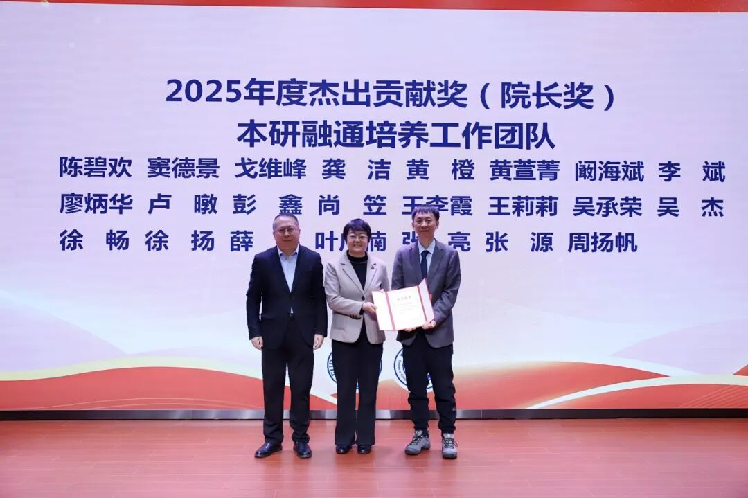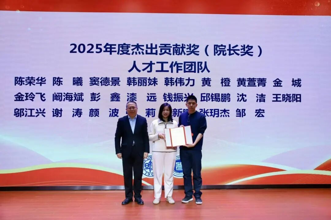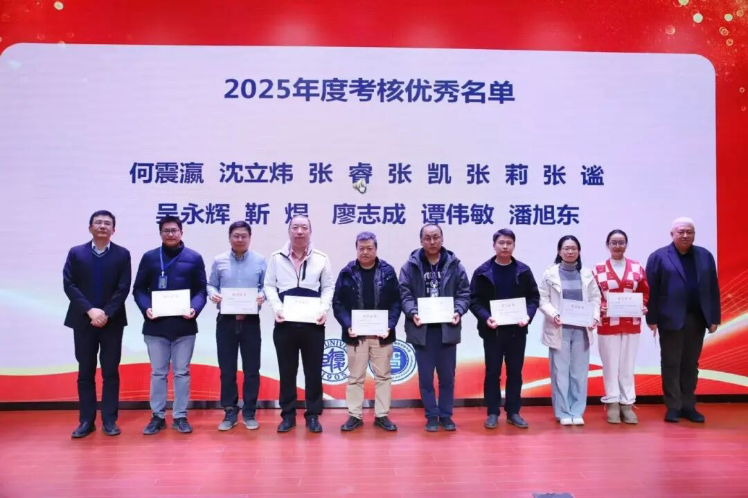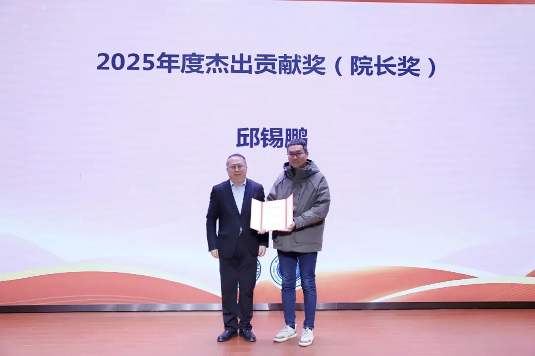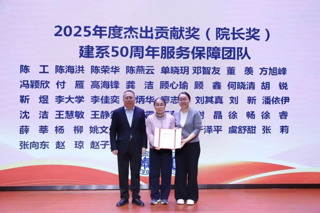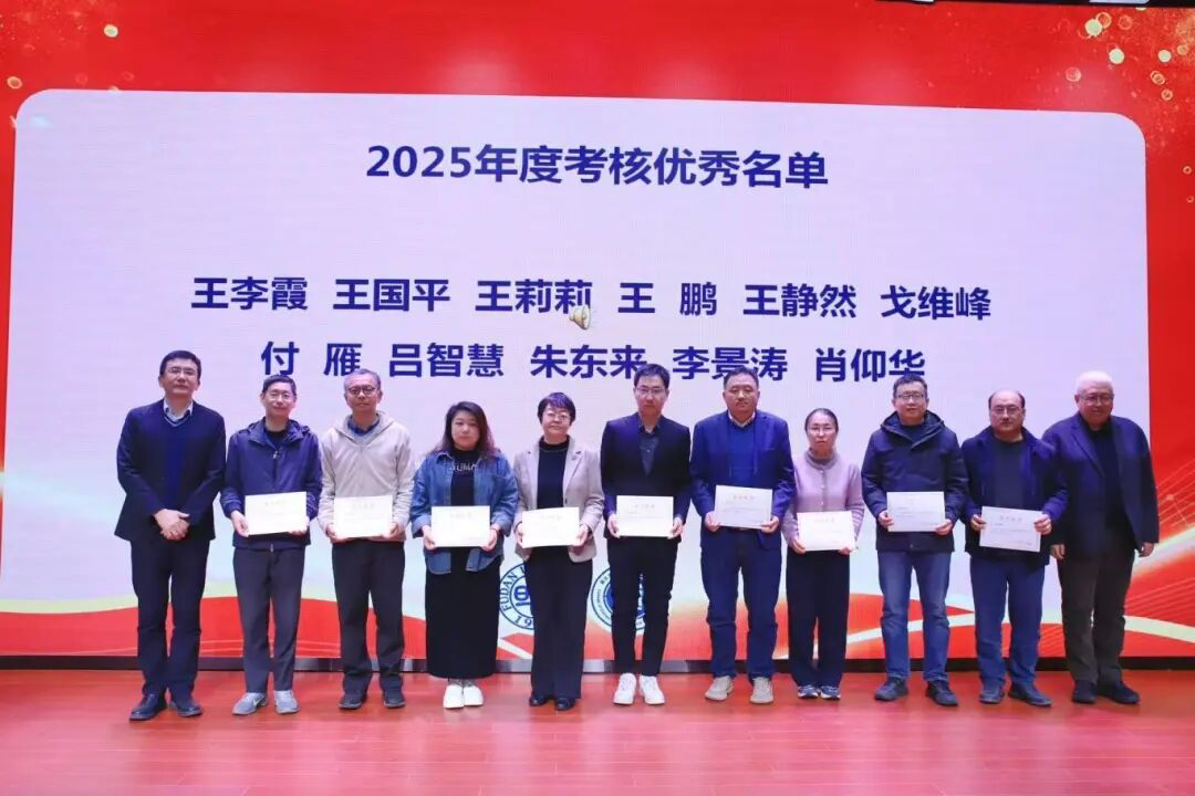 在表彰环节,汪源源为学院2025年度杰出贡献奖(院长奖)获得者及团队颁奖,王新、杨珉为2025年度考核获得优秀的老师颁发荣誉证书,对各位老师一年来的辛勤付出表示感谢。