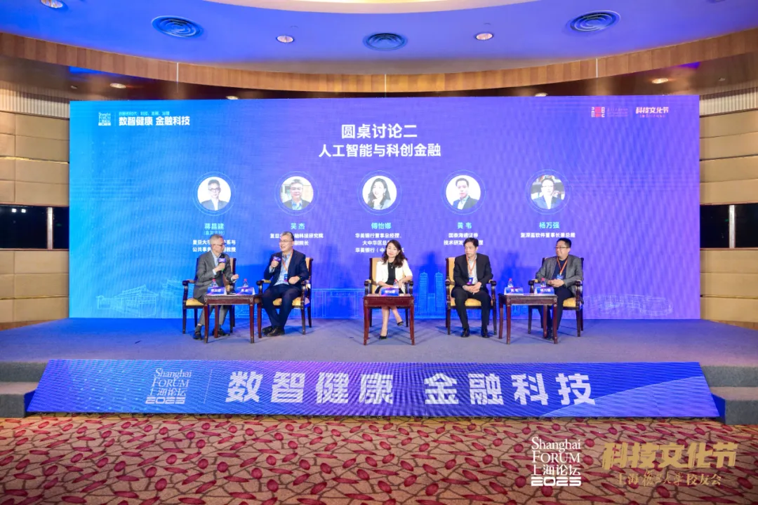 圆桌讨论二以“人工智能与科创金融”为主题,华美银行董事总经理、大中华区总裁兼华美银行(中国)行长傅怡娜;国泰海通证券技术研发部总经理黄韦;复旦大学金融科技研究院常务副院长吴杰;复深蓝软件董事长兼总裁杨万强作为圆桌嘉宾,深入探讨了人工智能与金融科技的融合路径、挑战和机遇。
